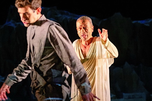 Nun tritt das Ganze ohnehin unter der Maxime an, die Oper nähere sich den zeitlosen Mechanismen der Gewalt „über Klang“ an. Fast noch eine Untertreibung. Van Schoors Partitur setzt mit ihrer Vernetzung von westlichen Standards und Elementen orientalischer oder syrischer Ausdrucksformen diesen selbst gewählten Anspruch mehr als um. Die Musik- und Klangsprache entzieht sich dem Versuch einer einheitlichen Begriffsfindung. Dazu ist das fein gesponnene Geflecht aus Orchestersequenzen, elektronischen Klängen, Anleihen an die Vierteltonmusik, meist deklamierenden Sängerpassagen und den teils traditionalistischen Einsätzen von Chor und Extrachor des Stadttheaters – in der Einstudierung von Jan Hoffmann – viel zu komplex. Nicht zu vergessen das permanente Bemühen von Schoors um lebendiges und stimmiges Lokalkolorit. Geleistet wird das von vier syrischen Sängern sowie einem syrischen Solosänger, dem Cellisten Mathys Mayr und Evgeni Ganev an Tasteninstrumenten, die außerhalb der eigentlichen Partitur existieren und ihre Musikkultur praktisch mit dem Instrumentenkoffer hergebracht haben. So ist dann auch die Versicherung glaubhaft, die eine oder andere Melodie stamme direkt aus Aleppo. Bestens zusammengehalten wird dieser west-östliche Musikdivan von Martin Spahr, Kapellmeister des Philharmonischen Orchesters Gießen.