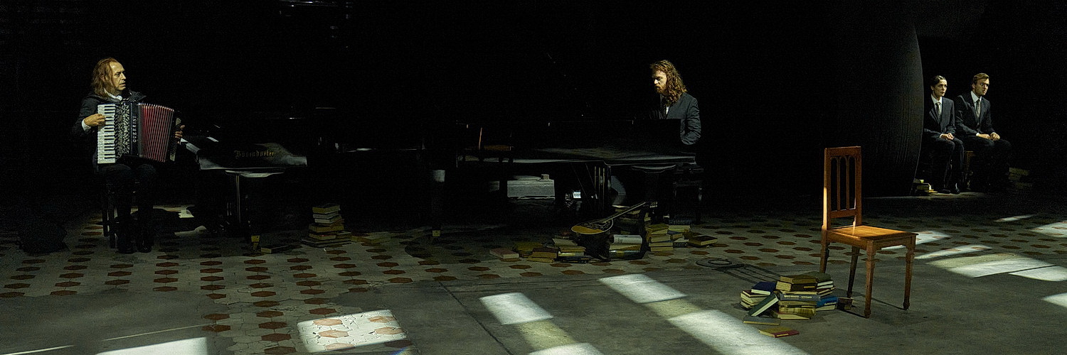 Jan Bülow, Debbie Korley, Annamária Láng, Katharina Lorenz, Michael Maertens und Markus Scheumann wechseln immer wieder die Rollen, häufig genug wenig einsichtig, aber weitgehend textsicher. Einer der Einfälle, die chori­schen Auftritte der Truppe, berei­chert den Abend ebenso wie die Musik, die von Thomas Wegner in ein wunder­bares Klangbild umgewandelt und einge­bettet wird. Tommy Hojsa und Komponist Josh Sneesby inter­pre­tieren die Live-Musik auf der Bühne. Ein zehnmi­nü­tiges, stakka­to­haftes Vorspiel auf den Flügeln gibt das Thema vor, das hinter­gründig immer wieder auftaucht, vom Akkordeon überspielt und mit Schlagwerk akzen­tuiert wird. Songs von Pink Floyd, The Doors, Timber Tembre, The Young Gods und Frankie Valli werden fast bis zur Unkennt­lichkeit ausein­an­der­ge­zogen. Und schließlich sorgt der Auftritt des Ruhrkohle-Chors unter Leitung von Harald Jüngst mal aus der Ferne, endlich im persön­lichen Erscheinen für Eindruck.