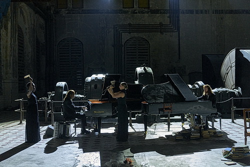 Der Ausblick auf die Bühne ist selbst aus der letzten Reihe der steil aufstei­genden Tribüne ausge­sprochen eindrucksvoll. In der Bühnen­mitte sind die Maschinen als Sinnbild der ursprüng­lichen Funktion der Halle verblieben. Davor hat Martin Zehet­gruber seine Bühne instal­liert. Zwei Konzert­flügel sind auf der linken Seite aufge­stellt. In den Zwischen­räumen der Maschinen sind Schlag­werke unter­ge­bracht. Davor gibt es ausrei­chend Platz für Bücher­stapel und ein paar Stühle. Die übermanns­hohen Fenster, die die Bühne auf drei Seiten umgeben, sind mit Brettern verschlagen. Hier ist ausrei­chend Platz, um zwei Fußball­mann­schaften auftreten zu lassen. Frey kommt vorerst mit weniger Personal aus, um Der Untergang des Hauses Usher aufzuführen.