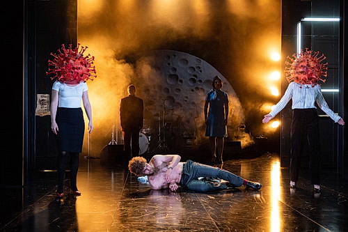 Ein volumi­nöses Schwein in goldenen Ballett­schuhen, das gefährlich rot gefärbte C‑Virus, das in mehreren Exemplaren durch die Szenen geistert, ein kaltes, jensei­tiges Bühnenbild mit surrealem Einschlag – ist das die europäische Wirklichkeit, der wir heute begegnen? Ein Sprecher: „Meine Damen und Herren, ich begrüße Sie zur Schweineshow …“
