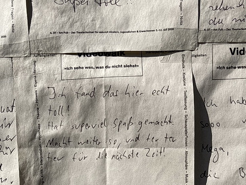 Auch das Deutsche Theater Göttingen ist um die Schließung des gesamten Proben­be­triebes nicht herum­ge­kommen. Als eine Alter­native hat es das diesjährige Festival DT – Am Puls in Form von Video­walks entwi­ckelt, die vor allem den Freunden des Theaters an Video­sta­tionen angeboten werden und Einblicke in die Theater­arbeit gewähren. Eine Idee, die offenbar großen Zuspruch findet, wie die zahlreichen Dankes­bot­schaften auf einer Anschlag­tafel am Eingang belegen – eine schöne Geste unter Freunden der Kultur.
