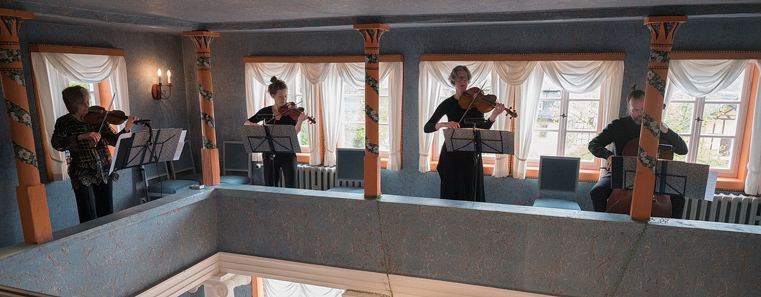 Der Kantate ist das Vivace-Andante der Sinfonia in D‑Dur von Georg Christoph Wagenseil vorangestellt, das stilistisch sehr gut dazu passt und der Kantate mehr Körper gibt. Das fünfköpfige Ensemble unter der Leitung von Gerd Amelung am Cembalo ist in der offenen und schmalen Empore des Theaters platziert – außer Sichtweite des Publikums. Es spricht für die hervorragende Akustik des Raumes, dass der Klang sich homogen und rund entfaltet und sich dem Gesang unterordnet, obwohl die Musiker doch – Corona-gerecht – entlang der Breite der Bühne platziert sind. Amelung gibt subtile Impulse und suggeriert den Puls der Musik, die sein Ensemble und die beiden Sängerinnen in ein musikalisches Zusammenspiel umwandeln.