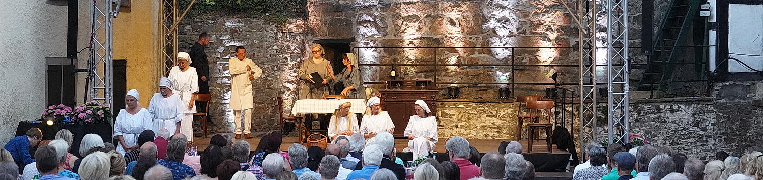Ja, die Sommer­spiele haben es einfacher als beispiels­weise die Stadt­theater. In Hohen­limburg gibt es nicht den Wunsch nach Gesell­schafts­dis­kursen in dunkel­grauen Anzügen und nacht­schwarzen Abend­kleidern. Die Schloss-Spiele haben genau einen Anspruch: Sie wollen beste Unter­haltung bieten. Und die Besucher erscheinen tiefen­ent­spannt in der Kleidung, in der sie sich in ihrer Freizeit wohlfühlen. Künst­le­ri­scher Leiter ist Dario Weberg, der abseits der Schloss-Spiele das Theater an der Volme unter seinen künst­le­ri­schen Fittichen hat. Die betrieb­liche Leitung des Theaters hat Ehefrau Indra Janorschke übernommen – wenn es ihre Zeit erlaubt. Denn eigentlich schreibt sie unter dem Namen Felicity Whitmore Romane, die sehr erfolg­reich bei dtv erscheinen. In diesem Sommer wächst zusammen, was zusammengehört.