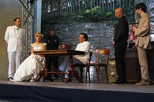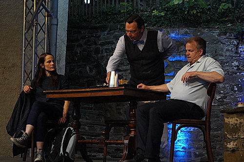Wenn ein Bühnenwerk satte drei Stunden inklusive Pause dauert, ist es kaum verwun­derlich, wenn sich eine Besucherin in der Pause damit brüstet, das Buch bereits gelesen zu haben und bestä­tigen kann, dass sie alles wieder­erkennt. Mit den Kürzungen ist es also nicht allzu weit her. Dass der Großteil des Publikums trotzdem bis zum Ende durchhält, liegt an der Insze­nierung, die Stefan Schroeder und Dario Weberg gemeinsam liebevoll vorge­nommen haben, und Schau­spielern, die mit ihren Leistungen glänzen. Eine Souffleuse ist weit und breit nicht zu sehen, trotzdem gibt es so gut wie keine Hänger in einem riesigen Textkon­volut, von dem etliche Darsteller mehrere Rollen übernehmen. Die Bühne ist schlicht, aber zweck­mäßig gehalten. Ein Tisch für Gespräche, eine Anrichte im Hinter­grund, die allerlei Geheim­nisse beinhaltet und zwei Stühle, deren Bedeutung sich nicht erschließt. Sie bleiben nämlich unbesetzt. Silke Hank hat die Darsteller so einge­kleidet, dass sich die Erklärung zweier unter­schied­licher Zeitebenen eigentlich erübrigt, aber Schroeder wollte auf Nummer sicher gehen. Und so dürfen Dirk Hering und Stefan Sasse ihre Beleuchtung ebenfalls auf die beiden Zeitebenen ausrichten. Noch deutlicher wird es bei der Bühnen­musik, die Martin Brödemann kompo­niert hat und in Dur für die Gegenwart und in Moll für die Vergan­genheit erklingen lässt. Er ist auch für die lautma­le­ri­schen Effekte verantwortlich.