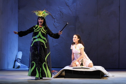 Wilgenbus lässt seiner Fantasie freien Lauf und findet in Bühnen­bildner Peter Engel einen konge­nialen Partner. Die beiden vollbringen die Meister­leistung sich vorzu­stellen, wie Haydn das in Eszterháza insze­niert hat, also mit aller­ein­fachsten Mitteln, und wie das heute aussehen könnte. Das Einheitsbild einer umlau­fenden Wand, die auf der Hälfte der Bühnenhöhe endet bildet die Arena für den Einsatz möglichst vieler Bühnen­ele­mente. Und während sich in der zweiten Hälfte der Aufführung die Handlung erschöpft, öffnet sich die Wand nach hinten und bietet einen Ausblick auf eine ganz ungewöhn­liche Perspektive. Das muss man selbst gesehen haben. Chris­tiane Luz hat dazu Kostüme gefunden, die im Sinne des Konzepts arbeiten, aber der Erotik zuwider­laufen. Auch wenn das nicht ganz nachzu­voll­ziehen ist, schadet es der Insze­nierung nicht. Hans-Joachim Köster setzt die Handlung in ein ganz wunder­bares Licht. Große Blenden setzen das Geschehen vielfarbig in immer neue drama­tur­gische Spannung, in der auch immer Platz für einen Verfolger ist. Da werden wirklich Höhepunkte ins rechte Licht gesetzt. Großartig.