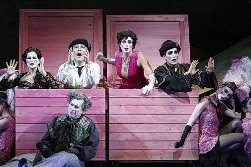 Bühnen- und Kostümbildner Lukas Noll fasst das Geschehen in einen ovalen, raffiniert und vielfältig ausgeleuchteten Rahmen ein, der einen bewusst künstlichen Eindruck erweckt, der durch die skurrilen, farbenprächtigen Kostüme der deftig geschminkten Figuren verstärkt wird.