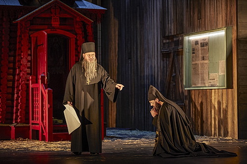 Die für 2020 geplante Godunow-Inszenierung musste coronabedingt verschoben werden. Die Premiere 2023 – inzwischen nimmt der russische Angriff auf die Ukraine an mörderischer Intensität zu – fokussiert konsequent, ohne vordergründig zu polemisieren, auf eine bedrückend hoffnungslose, desorientierte Volksmasse. Eine, die sich nicht artikuliert und nicht erkennen kann oder will, dass Herrschaft auf Machtstrukturen aufgebaut ist, die sich immer gegen sie selbst wenden werden. Dass Godunow unausweichlich scheitern muss, obwohl er um die Liebe des Volkes buhlt, legt Castorfs Inszenierung bloß.