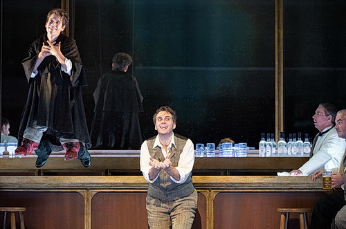 Gideon Poppe spielt und singt die verschie­denen, äußerlich komischen, aber nicht minder skurril-abgrün­digen Diener­partien, die auf ihre Weise immer auch Türöffner zu einer unbestimmten zweiten Ebene der Realität verkörpern, mit exakt der notwen­digen Hinter­grün­digkeit der Rollenkonzepte.