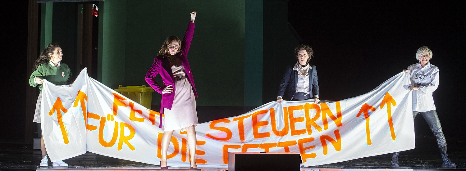 Lustvoll lassen sich die Frauen auf das Spiel mit Falstaff ein. Es ist ein Ausbruch aus der sonst so sauberen, geregelten und engen Welt. Sie bringen sich mit Flachmann und ordentlich Zigaret­ten­genuss in Schwung und genießen das Risiko der kleinen Flucht aus ihrer bürger­lichen Welt und die Erfahrung einer anderen Lebens­ein­stellung, die ihnen die Begegnung mit Falstaff ermöglicht.