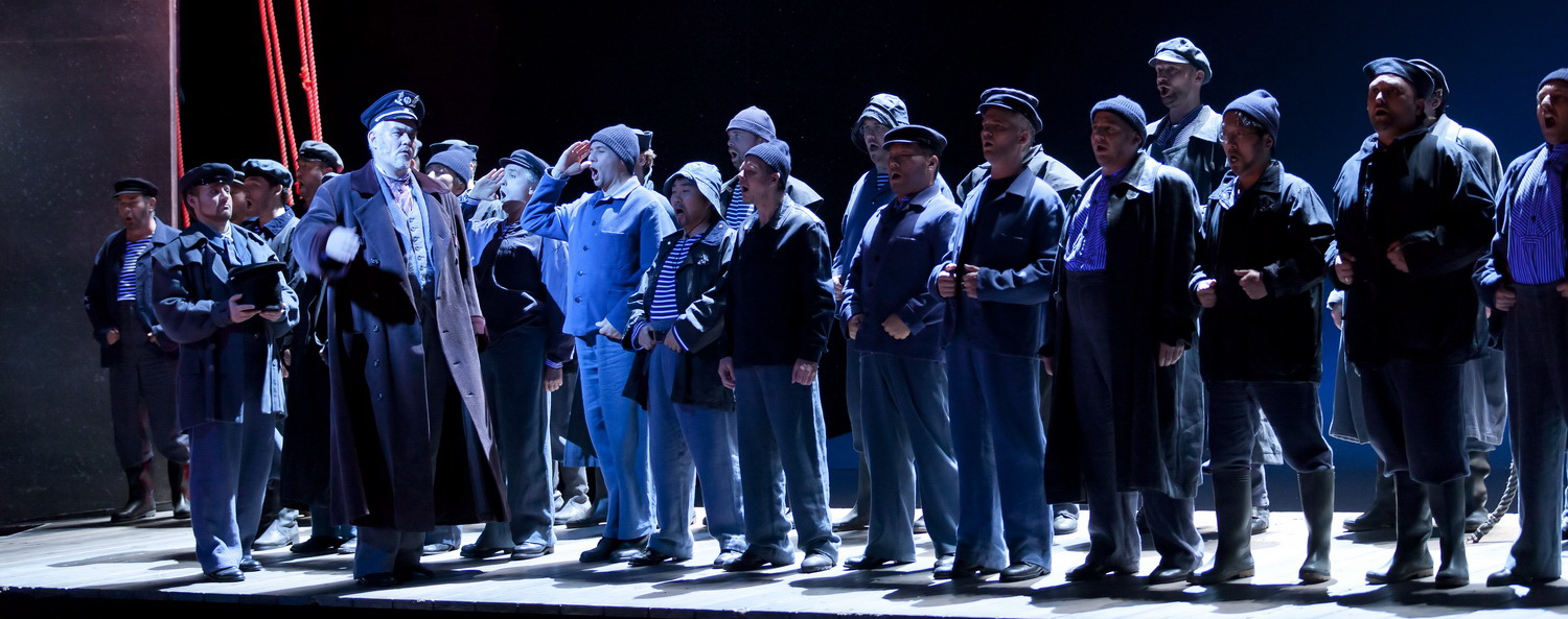 Seit 1996 ist die Produktion des fliegenden Holländers im Reper­toire der Staatsoper Hamburg und hat es in 22 Jahren auf 73 Vorstel­lungen gebracht. Nicht gerade üppig. Vielleicht liegt es auch daran, das die Insze­nierung von Marco Arturo Marelli nur sehr selten eine roman­tische Atmosphäre entwi­ckelt, geschweige denn dem Erlösungs­drama wirklich nachspürt. Wie seine Arbeit vor 22 Jahren gewirkt hat, kann man heute nicht beurteilen. Wirklichen Bühnen­zauber entwi­ckelt sein Bühnenbild nur in Verbindung von Manfred Voss‘ Beleuchtung, die dem angedeu­teten Natura­lismus das Leben einhaucht. Von Gewit­ter­stürmen bis zum maritimen Leuchten ist alles dabei. Dagegen sind die rot angeleuch­teten Taue, als Symbol für das Schiff des Holländers, die ein wenig schüchtern von der Seite herein­baumeln, wenig unheimlich. Dalands Taue, seine Wohnung aus Tuchwänden sind wesentlich dominanter. Sehr schön einge­setzt ist die Bühnen­technik, die den Wechsel aus Dalands Haus an die Küste erlaubt. Auf diese Art und Weise bleibt auch Sentas Ende, die dem Holländer nacheilt, ungewiss.