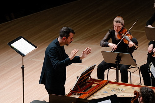 Händel gibt seinem Tolomeo durch Verzicht auf erhöhten Aufwand und übliche Spezialeffekte der Ausstattung sowie durch Konzentration auf lediglich fünf Akteure einen fast schon puristischen kammermusikalischen Charakter, was Il Pomo d’Oro in die Karten alias Noten spielt. Es gibt keinen Chor und bei Ausnahme von zwei Hörnern keine Blechbläser, die aber bei ihren wenigen Einsätzen von Christian Binde und Ricardo Rodriguez großartig in Szene gesetzt werden. Für den Händel-typischen Rhythmus sorgen insbesondere zwei Cembali. Sie sind vis à vis gestellt sind und werden von Maria Shabashova sowie Corti, der phasenweise in Doppelfunktion agiert, in der Weise gespielt, dass sie wie eine Einheit zu vernehmen sind, zumeist jedenfalls.