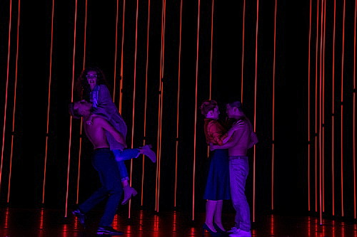 Dabei greifen neben der hinter­grün­digen und quirligen Perso­nen­führung das Bühnenbild von Sarah-Katharina Karl mit nervös blendenden Stelen, die Kostüme von Esther Bialas sowie das Licht von Sascha Zauner vorzüglich ineinander.