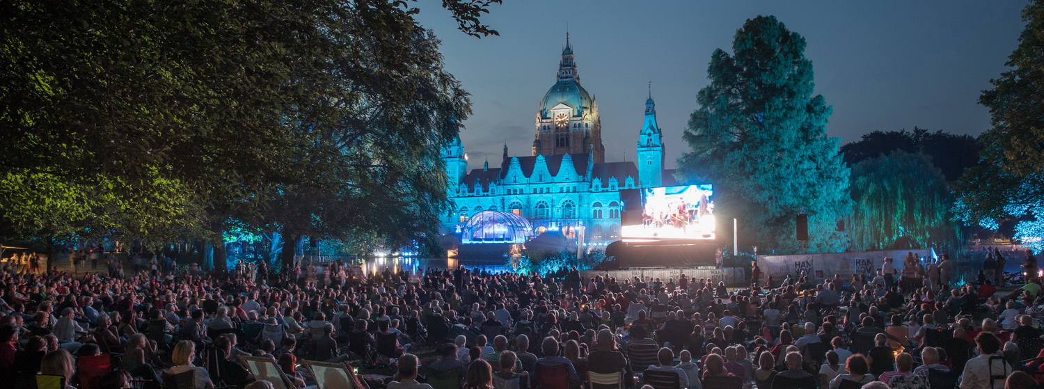 Bereits zum fünften Mal findet das NDR-Klassik-Open-Air statt. Nach Tosca, La Bohème, La Traviata und Rigoletto muss nun Mozarts Don Giovanni auf der Bühne hinter dem Neuen Rathaus in Hannover zur Hölle fahren. Die Kulisse im späten Abendlicht ist himmlisch. Der palastähnliche Prachtbau von 1913, der tatsächlich ein tolles Schloss für den Edelmann abgäbe, ist wunderbar stimmungsvoll illuminiert. Am Maschteich hinter dem Rathaus ist die Bühne aufgebaut, die sich Sänger und die NDR-Radiophilharmonie teilen. Gut 2000 Zuschauer finden vor der Bühne einen Sitzplatz. Die anderen interessierten Opernbesucher lassen sich kostenlos im Maschpark nieder. Die Oper können sie dort im Picknick-Ambiente „nur“ auf Leinwänden verfolgen, aber haben dafür immer den traumhaften Blick auf die gesamte Kulisse. Das ist Niedersachsens Pendant zu den atmosphärischen Steintribünen der Arena von Verona.