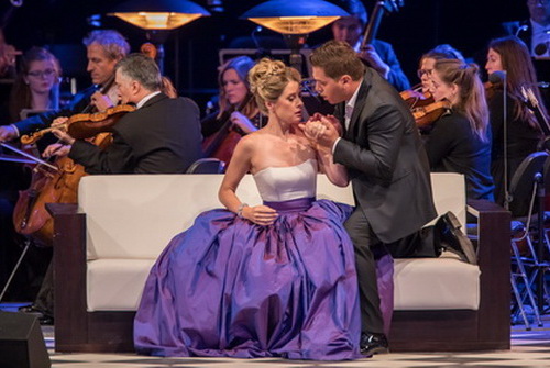 Da hat man das Gefühl, dass die Sänger aus sich heraus einfach schon das Nötigste leisten können. Luca Pisaroni schüttelt seinen Leporello ja mit links aus dem Ärmel. Ohne falsche Mätzchen lässt er seinen Bassbariton mit dieser wunderbaren Aussprache frei fließen und bringt mehr als genügend Ausstrahlung für diese Art Opernevent mit. Er stand auch schon mit Ludovic Tézier als Don Giovanni zusammen auf der Bühne, so dass das Zusammenspiel zwischen den beiden auch funktioniert. Tézier ist eher ein Giovanni der alten Schule, der seinen Bariton mit italienisch-geschultem Legato elegant und großformatig einsetzt. Ein klassischer Kavalierbariton, der die Canzonetta zu einem echten Schmachtfetzen macht oder auch die Verführung von La ci darem la mano ganz weit aussingt. Dass er dieses Duett mit seiner Frau Cassandre Berthon in der Rolle der Zerlina singt, macht es natürlich noch etwas schöner. Berthon wirkt in der Generalprobe noch etwas unsicher, steigert sich dann aber zu der Aufführung am Samstag.