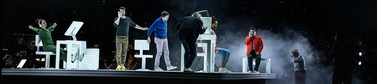 Die sieben im Internet-Café anwesenden Personen mit den in den Wieder­ho­lungen wechselnden Rollen­spielen werden von hoch-engagierten Sängern der Staatsoper Hannover, Céline Akçağ, Tahnee Niboro, Gudrun Pelker, Yannick Spanier, Richard Walshe und Sasha Zarrabi sowie dem Schau­spieler Mathias Max Herrmann zur eindringlich zur Darstellung gebracht. Die vermummten und Inuit-ähnlichen Personen der letzten Szene im ewigen Schnee verkörpern Mitglieder der Statis­terie der Oper.