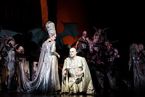 Wenn allerdings im zweiten Akt mit einer Spieldauer von nochmals deutlich über einer Stunde dieselben Elemente erscheinen, hängen die Effekte in ihrer teilweise kindlich-albernen Geste und Kostümierung durch: Die deutschen Original-Opern-Texte bleiben bleiern, die Musik – gelinde gesagt – wenig dynamisch. Das optische Instrumentarium hat sich schnell verbraucht. Viel zu lang zum Beispiel die kontrapunktisch-komische Trinkerszene.