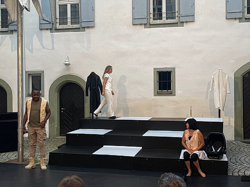 Der Aufführungsort im Schloss Wasseralfingen ist gut gewählt: Der kleine Schlosshof schafft eine dichte, konzentrierte Atmosphäre. Eine schwarze, stufige Bühne an der einen Seite, zwei Kleiderständer, ein Klavier, ein Schlagzeug, die Zuschauer auf Bänken um einen alten Brunnen geschart, bilden das Ambiente.