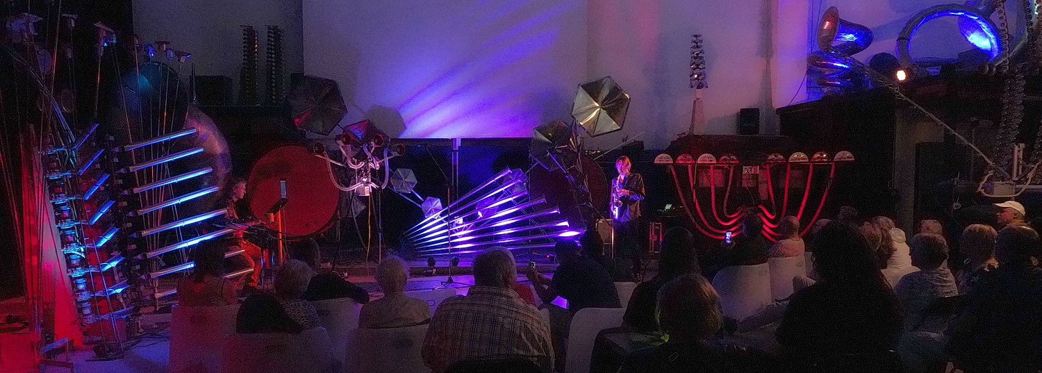 Einmal im Jahr veranstaltet der Förderverein des Kunstwaldes die Aktion Licht an! Dann wird der Park im vorderen Teil illuminiert und in der Maschinenhalle finden Konzerte statt. Was dem einzelnen wichtiger ist, muss er selbst entscheiden. Denn mit der Beleuchtung der Bäume und Sträucher, die Wolfgang Flammerfeld und sein Team mehr als eindrucksvoll einrichten, geht auch eine Beschallung einher. DJ Noe präsentiert einer Minderheit des Publikums Lounge Music. Viel aufregender als die Töne von der Festplatte sind allerdings die Konzerte, die Christof Schläger und Michael Niesmann im Klangraum T ausrichten. Mit einer Maschinenhalle im herkömmlichen Sinne hat das Gebäude inzwischen nur noch reichlich wenig gemein. Wohin das Auge reicht, sind Maschinen-Instrumente aufgebaut. Überdimensionale Schalltrichter wechseln sich mit großen Bögen oder Röhrensammlungen ab. Über den Boden schlängeln Leitungen, die Luft oder Elektrizität führen. Anlässlich dieses Abends ist auch die Halle farbenfroh ausgeleuchtet. In der Hallenmitte bis zum Ausgang sind nicht etwa langweilige Einheitsstühle aneinandergereiht, sondern alle möglichen fantasievollen Sitzgelegenheiten vom Sofa über die Matratze auf dem Boden, die Bierbank bis zu Sesseln und Designer-Plastikfauteuils aufgestellt. Hinter ein paar Stuhlreihen finden sich Sitzgruppen mit ausgefallenen Tischen. Nichts anderes, möchte man meinen, könnte in diesem Industrie-Denkmal Platz finden – oder zum Publikum passen, das überwiegend aus der Nachbarschaft kommt und sich hier gleich wie zuhause fühlt.