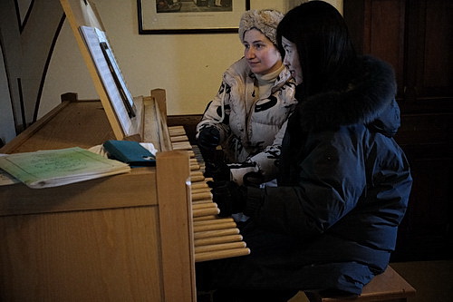 Im zurückliegenden Semester hat die Hochschule für Musik und Darstellende Kunst Stuttgart Porizko als Gastdozentin eingeladen, um das Seminar Carillon und Turmglockenspiel durchzuführen. Die Veranstaltungen fanden im Stuttgarter Rathaus und in der Stiftskirche Herrenberg mit fünf Teilnehmern statt. Jetzt treffen die sich in Herrenberg, um zum Abschluss des Seminars ein Konzert zu veranstalten. Dem eigentlichen Ereignis geht eine letzte Übungseinheit im Einzelunterricht voran, die an einem Übungstisch im ehemaligen Archiv der Kirche, das über eine enge Wendeltreppe in der Ecke zwischen Orgel und Altarraum erreichbar ist. Hierher kommt auch Chaewon Hwang, Studentin der Schul- und Kirchenmusik und Teilnehmerin am Master-Studiengang Orgel. Sie kann zwar nicht am Konzert teilnehmen, möchte aber gern noch die Gelegenheit nutzen, Bearbeitungen von Tschaikowskys Tanz der Zuckerfee aus seiner Nussknacker-Suite und Djingle Bells einzuüben. In dem kalten Raum werden die Klöppel des Instruments – Tastaturen sind eher selten – mit Handschuhen bearbeitet.