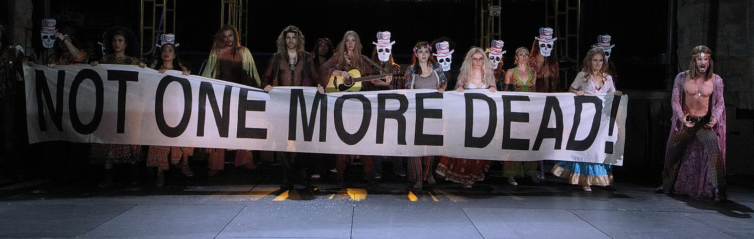 Regisseur Gil Mehmert nennt die Uraufführung einen „Urknall am Broadway“, eine „radikal neue Erzählform“. Er selbst hat dieses Jugendprotest-Friedens-Antivietnam-Erzählstück mit den langen Haaren inzwischen mehrfach inszeniert, in München, Hildesheim und jetzt zum zweiten Mal in Bad Hersfeld. Kein Zweifel, Mehmert ist der anerkannte Spezialist für gelungene Musical-Inszenierungen. Es ist fast so, als wenn jede Generation ihre Protestwelle findet, ob es die Jugendbewegung, die Studentenbewegung oder eben, zur Zeit des amerikanischen Vietnamkrieges die Hippie-Bewegung oder heute die aus dem kleinen Dänemark gestartete Umweltbewegung ist, alle haben ihre besondere Ausdrucksformen gefunden. Bei den 1960-ern sind es die Titel gebenden Haare: „Es schießt und sprießt und wächst eben wie verhext … schulterlang und länger“. Es sind nicht die aktuellen brennenden und bewegenden Fragen, die vor allem das junge Publikum anziehen, Mehmert sagt „Die Handlung war keine.“ Es ist die rockig-poppige, fetzige Musik, die ein junges und vielfach auch älteres Publikum anspricht und fasziniert. Die „Botschaften“ dieser Musicals, auch dieser Inszenierung sind verhalten, ja versteckt, selten plakativ. Da weht über der Bühne eine schmutzig verunzierte amerikanische Flagge, eine Verunglimpfung des nationalen Emblems, wie man sie von den respektlosen Arbeiten des Malers Jasper John aus Georgia kennt. Für viele Amerikaner ein absolutes no go. Für Mehmert bringen die „auf der Bühne anwesenden Charaktere … eine Live-Performance“ ihre Botschaft in Form eines Sit-In. Die „Schönsten“ einer Misswahl aus Cuba, Russland, Vietnam und Korea lockern den Abend auf. Ein Soldat in Uniform und Darsteller mit Gasmasken erinnern daran, dass es irgendwo draußen noch eine andere Welt gibt. Ein großes Peace-Zeichen, das berühmteste Protestzeichen der Welt, wird aufgerichtet und schließlich unter dem Beifall der Protagonisten verbrannt.