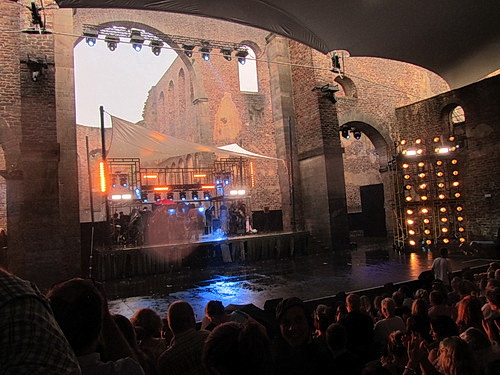 Zunächst halten die Zuschauer das leichte Glitzern über der Bühne und vor den Schweinwerfern für einen weiteren Regietrick, der den nächsten Song vorbereiten soll. Als dann aber klatschende Geräusche hinzukommen und die ersten Zuschauer auf den Randplätzen merken, dass ihre Haare und Sommergarderobe erst feucht, dann aber richtig nass werden, wird allen klar: Das ist ein heftiger Sturzregen, der für knappe zehn Minuten die Stiftsruine unter einen Wasserfall verlegt, da helfen alle Zeltdächer über dem Zuschauerraum wenig – es schüttet in Strömen. Die Musiker rennen nach Plastikabdeckungen für ihre Instrumente, die Elektroniker fürchten um ihre Geräte, die Darsteller spielen und singen in triefender Kleidung weiter, ein Teil des Publikums flieht vor dem Wassereinbruch. Kurz: Die Aufführung wird unterbrochen, nach dem Schauer dauert es einige Zeit, bis alle elektronischen Kontakte wieder hergestellt sind und das Stück – schon ein wenig gestört – vor den standhaften Zuschauern zum songreichen Schluss kommt – Anerkennung für die Fortsetzung des Nachmittags.
