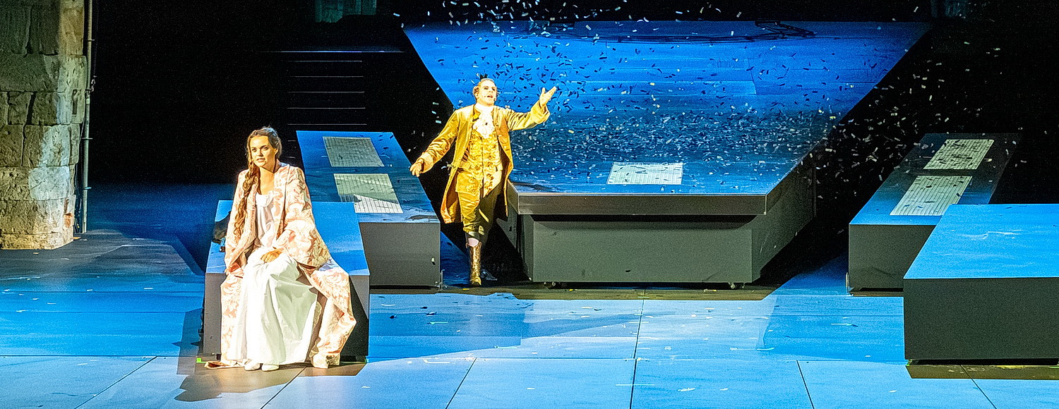 Mehmert ist eine exzel­lente Wahl für das gewagte Experiment. Neben Musicals gehören eigene Bühnen­fas­sungen von Filmstoffen oder Open-Air-Produk­tionen zu seinem Schaffen. So setzte er 2014 Sönke Wortmanns Das Wunder von Bern als Musical um, und seine Insze­nierung von Jesus Christ Superstar in Dortmund sicherte ihm mehrere Musical-Preise. Besser als Hinkel, der selbst in einer Neben­rolle mitspielt, mit den Sommer­nachts­träumen, schafft er es, das Theater für neue Zielgruppen zu öffnen, die ihm sonst eher skeptisch gegen­über­stehen. Ohne das Stück an sich aus den Augen zu verlieren, ergibt die Kombi­nation von Schillers Drama mit der Musik der Toten Hosen eine Einheit. Die Songs spielt eine Live-Band links und rechts auf der Bühne – nicht die Toten Hosen – aber ihr Spiel hat Klasse und reißt Schau­spieler und Publikum mit. Für die Bühne ist Jens Kilian, für die Kostüme Heike Meixner zuständig.