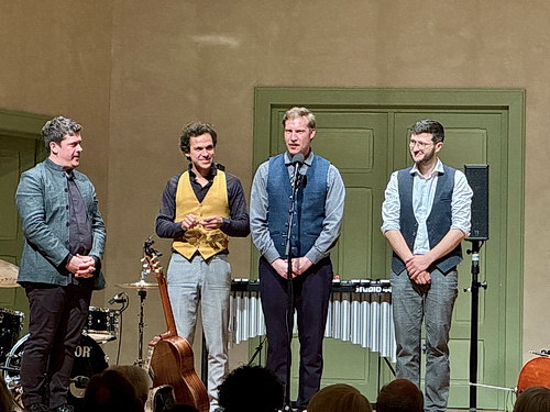 In den vollen Saal in Hohenems haben die vier Musiker die Winterreise von Franz Schubert mitgebracht, in dieser besonderen Version eine Uraufführung. Benner führt zu Beginn und immer nach sechs Liedern emotional und humorvoll durchs Programm. Was er da sagt, kommt beim Publikum sehr gut an, gibt er doch nicht einfach eine halb musikwissenschaftliche Erklärung der Lieder, sondern beschreibt sie aus seiner Sicht heraus. Er hat sich durch das Übersetzen der Lieder – übrigens, wie er mitteilt, am Strand in Hawaii mit den Füßen im Sand – intensivst damit auseinandergesetzt. Er erzählt die Geschichte des jungen Mannes, der durch die verschneite Landschaft wandert, mit angenehmer Stimme und leichtem amerikanischem Akzent beziehungsweise Wiener Dialekt, kleinen Fehlerchen im Deutschen und dadurch irgendwie näher am Geschehen. Emotional wirkt er, redet frei aus seinem Herzen, fern aller Metaphorik und Metaebene und richtig herzerfrischend. Schon hier merkt man, wie sehr ihn die Lieder gefangen nehmen. Ein kleiner Scherz noch über den Termin, der diese Winterreise bei der Schubertiade ausgerechnet im blühenden Frühlingsbeginn, am 1. Mai stattfinden lässt, denn eigentlich heißt es ja: „Der Mai ist gekommen, der Winter ist aus“. Aber, wie er so schön sagt, „Winterreise im Winter, das ist wie Knödel mit Knödel“, und dann geht’s los.