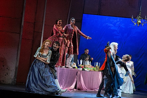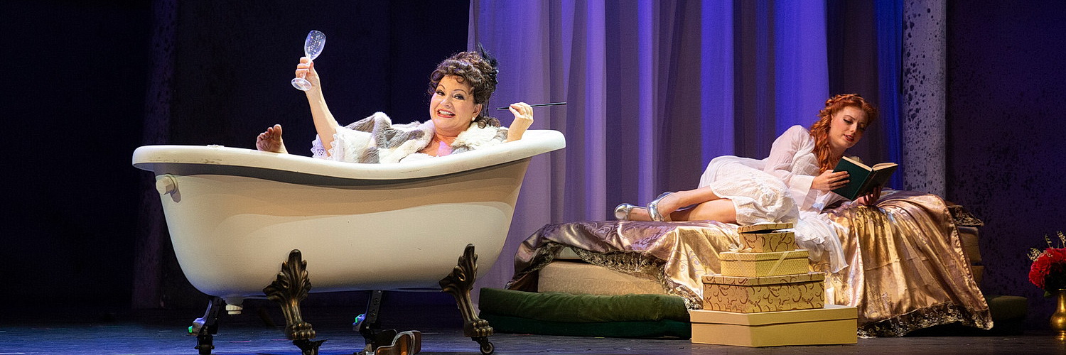 Ollendorfs erster Auftritt mit seiner großen Arie Und da soll man noch galant sein erfolgt im Bademantel und nacktem Oberkörper, im Beisein zweier leicht bekleideter, junger Damen. Wer die Operette näher kennt, dem fällt natürlich auf, dass nicht nur die Dialoge angepasst und teils gänzlich verändert wurden, auch die Liedtexte weisen Änderungen auf, was man vielleicht dramaturgisch begründen mag, aber auch einen starken Eingriff in das Original bedingt. Das muss man nicht zwangsläufig goutieren. So ist vom Original des Couplets von Ollendorf nichts mehr übrig geblieben. Auch in Lauras großer Arie Hell wie Glockenklang ist der zweite Teil mit der langen Koloratur gestrichen. Ob Corinna Koller, die letztes Jahr ein fulminantes Debüt als Kurfürstin in Zellers Vogelhändler gegeben hat, die Koloraturen nicht singen kann, ist die Frage. Von ihrem Rollenprofil ist sie über die Partie der Laura drüber, die einen sehr leichten und hohen Koloratursopran verlangt. Die bekannteste Melodie aus dem Bettelstudent ist sicherlich das Lied des Symon Ich knüpfte manche zarte Bande. Um die Zeitreise des Symon deutlicher darzustellen, darf oder muss Paul Schweinester die zweite Strophe in Englisch singen. Auch das passt nicht zu einer werkgetreuen Aufführung, wie man sie in Bad Ischl eigentlich gewohnt ist.