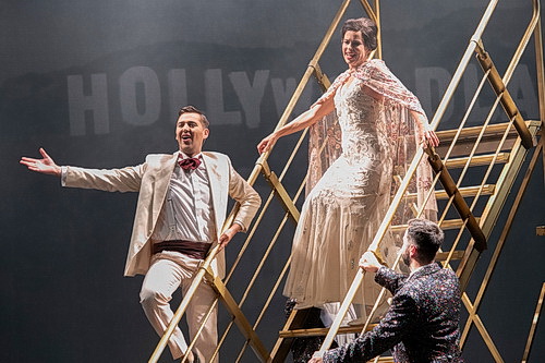 Festival-Intendant und Regisseur Thomas Enzinger versetzt das Publikum im Vorspiel der Operette in das glitzernde Film-Hollywood der dreißiger Jahre des letzten Jahrhun­derts, wir sind in „Holly­woodland“. Schon über 15 Minuten vor Beginn der Aufführung gibt es „Filmproben“ zu diversen Hollywood-Klassikern. Auf der Bühne begegnet man Charlie Chaplin, King Kong, Franken­steins Monster, Robin Hood, und eine Casting-Crew animiert die Zuschauer, sich für den Film zu bewerben. Immer wieder tönen witzige Ansagen aus dem Off: „Achtung, die Blutkon­serven für Nosferatu können in der Kantine abgeholt werden.“ Und Enzinger muss, als er das Publikum begrüßen möchte, selbst ein Inten­danten-Casting über sich ergehen lassen. Dann die Schre­ckens­bot­schaft: Es gibt kein Drehbuch, alle Schau­spieler werden nach Hause geschickt, die Produk­ti­ons­firma ist pleite. Nun kommt der große Moment der Produ­zenten-Tochter Marylou, die mit einem verrückten Plan einen „Reality-Film“ drehen möchte über ein franzö­si­sches Luxus­hotel mit ganz beson­deren Gästen, die sich in dem Film selbst spielen sollen.