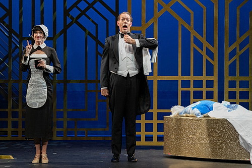 Enzinger hat mit der Revue-Operette nicht nur den Geschmack des Publikums getroffen, sondern insbe­sondere den Kompo­nisten Paul Abraham und die beiden Libret­tisten Alfred Grünwald und Fritz Löhner-Beda aus dem Tal des Vergessens geholt. Die fetzige Choreo­grafie stammt von Evamaria Mayer und die Einstu­dierung der Stepp-Tänze von Marie-Christin Zeisset, während Bühnenbild und die schönen Kostüme im Stil der dreißiger Jahre in den bewährten Händen von Markus Olzinger und Sven Bindseil liegen. Auch sänge­risch und musika­lisch macht das Lehár-Festival wieder von sich reden. Julia Koci als Infantin Isabella überzeugt mit kühlem Spiel und warmem, schön­k­lin­gendem Sopran. Maximilian Mayer ist ein Operet­ten­tenor par excel­lence, das hat er in den letzten Jahren am Gärtner­platz­theater in München immer wieder gezeigt, dessen Stimme langsam die Ausflüge ins Heldenfach unter­nimmt. Als Prinz Andreas Stephan ist er bestens besetzt.