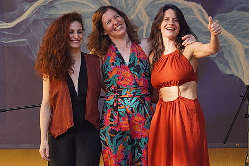 Wenn die Titel eine gewisse Natur­ver­bun­denheit aufweisen, kommt das nicht von ungefähr. Seit neuestem befasst sich das Trio mit Musik­öko­logie. Das ist eine neue Strömung in den Musik­wis­sen­schaften, die sich mit der Frage beschäftigt, wie Musik eine Verbindung zwischen den Menschen und der Natur herstellen kann. Glück­li­cher­weise bleiben theore­tische Überle­gungen aber außerhalb des Schlos­sin­nenhofs, und so lernt das Publikum Vizcaínos zweite Leiden­schaft kennen. In dem Lied Imli – eine Verball­hornung ihres Vornamens, mit der sie die Einhei­mi­schen während ihres Indien-Aufent­halts riefen – kommen auch die indischen Einflüsse zur Geltung.