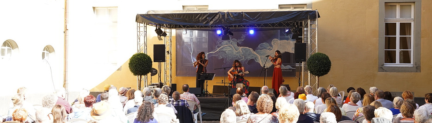 Einge­laden ist an diesem Sonntag das Ensemble Faya aus Lissabon, das damit den letzten Tag einer Deutschland-Tournee absol­viert, die es unter anderem in die Elbphil­har­monie in Hamburg führte. Faya, so heißt eine mystische Figur, eine Waldelfe oder eine Hexe, je nach Legende, in Ligurien. Die Natur­ver­bun­denheit und der weibliche Klang des Namens gefiel dem Gründungstrio und so entschied es sich dafür. Schon beim Betreten der Bühne versprühen die drei Musike­rinnen anste­ckende gute Laune. Dabei haben sie gerade Entschei­dungen hinter sich, die sicher nicht einfach waren. Gründungs­mit­glied Chiara Pelle­grini entschied noch vor der Tournee, das Ensemble zu verlassen, um in die italie­nische Heimat zurück­zu­kehren. Da stehen natürlich sofort grund­sätz­liche Fragen im Raum. Soll sich das Ensemble auflösen? Elena La Conte und Kristina van de Sand fanden glück­li­cher­weise eine andere Lösung in Gestalt von Mili Vizcaíno aus Spanien, die nun mit auf der Bühne im Innenhof von Schloss Dyck sitzt.
