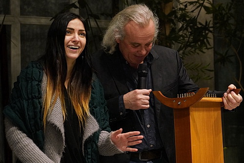 Nach diesem Spaß kehrt Natalia Vetrova zur Bühne zurück. Diesmal in Begleitung von Frank Henn, der zwei Monochorde und eine Klangschale mitbringt. Aber der Ausflug in die Esoterik bleibt aus, stattdessen wird mit den ungewöhnlichen Instrumenten die melodische respektive rhythmische Grundlage für Vetrovas Gesang gespielt. Anschließend greift Aeham Ahmad in die Tasten des Flügels, um Eigenkompositionen über bekannte Zitate wie etwa Beethovens Neunte zu spielen. Über eine kleine Improvisation kommt er am Ende zu dem Lied Die Gedanken sind frei. Sehr schön gemacht, und wirklich stimmen einige Besucher in den Gesang ein, ganz ohne Aufforderung. Das ist so ziemlich das Schönste, was einem bei einem solchen Konzertabend passieren kann. Dass Ahmad selbst deutsch singt, ist ja klar. Zwar in Syrien geboren, ist der Pianist aber seit zwei Tagen deutscher Staatsbürger, erzählt die Bürgermeisterin. Die sorgt dann auch resolut dafür, dass mit dem Schlussapplaus das Ende des Konzerts erreicht ist – schließlich haben auch die Rathausmitarbeiter, die die Organisation beispielsweise der Technik ehrenamtlich übernommen haben, ein Recht auf ihren Feierabend. Und nach zweieinhalb Stunden ist das dann so weit – nicht ohne vorher noch eine Schweigeminute für die Erdbebenopfer in Syrien und der Türkei eingelegt zu haben. Und wenn hier viele Nationalitäten friedlich beieinanderstehen, um der Toten zu gedenken, ist das der Moment, in dem man weiß, dass in dieser Welt doch noch manches in Ordnung ist.