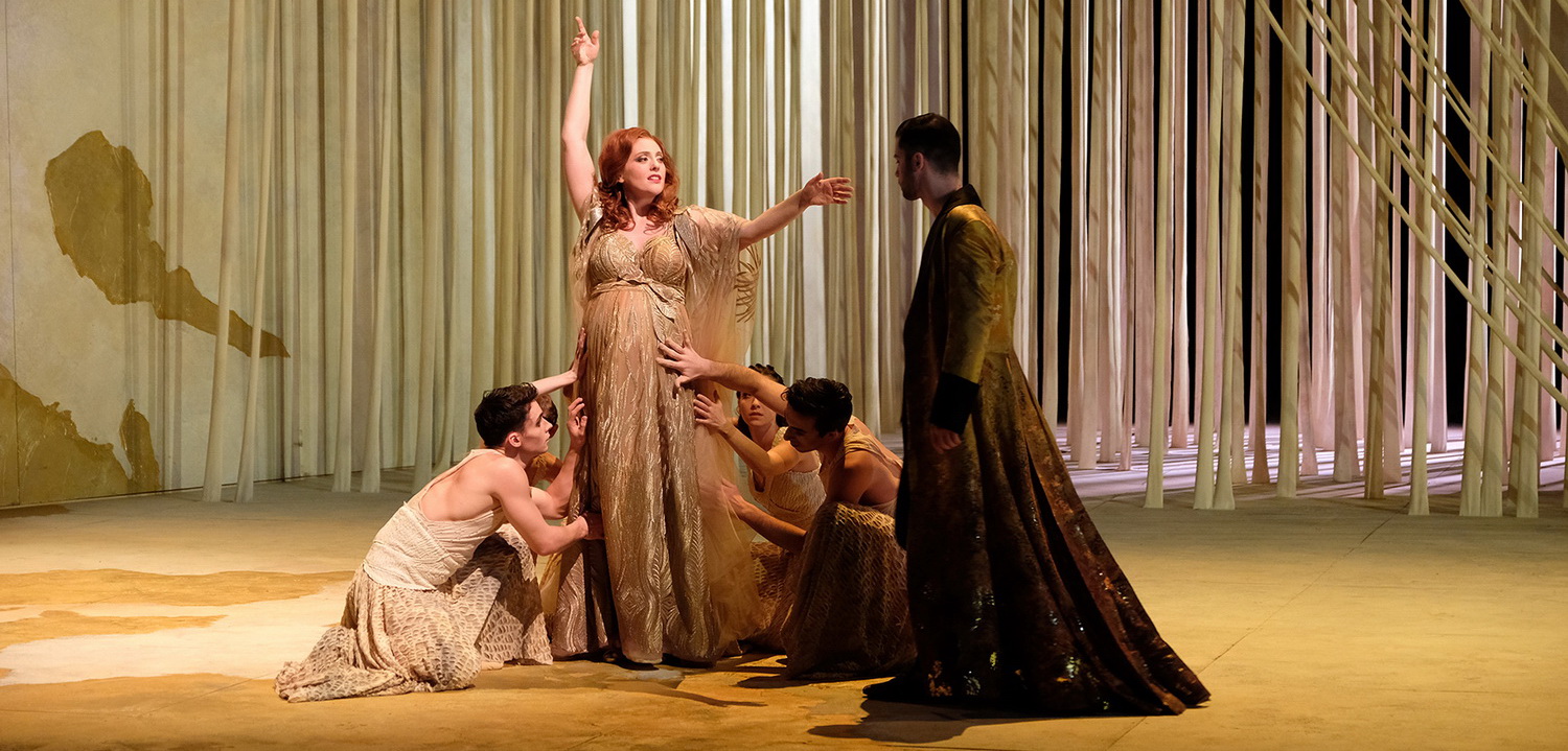 In diesem Konzept ist begreiflicherweise wenig Raum für eine übliche Ausstattung. Bühnenbildnerin Emily Macdonald und Lichtdesigner Cameron Mock begnügen sich mit zwei Wänden, die seitlich den ansonsten völlig leeren Boden begrenzen. Die darauf gemalten Bilder sind schon in die Jahre gekommen, was aber ihrer Hauptfunktion als Video-Screens nichts nimmt. Adam Larsen untermalt in seinen Projektionen den Zaubergarten Alcinas mit allerlei Symbolik aus Fauna und Flora, die gelegentlich für gehörige Heiterkeit im Publikum sorgen. Wenn Ruggiero zu seiner Bravourarie Sta nell‘ircana von der Löwin in Persiens Höhle ansetzt, erscheint hinter dem Fries das Abbild einer Löwin, die im sicheren Abstand zu dem Sänger durch die Szenerie wandert. Ansonsten bleibt das Auge des Betrachters vielleicht noch an weißgrauen Stricken und gerolltem Tuch hängen, das wie Schnüre von der Decke zum Boden reicht. Die von Chrisi Karvonides-Dushenko ohne Zeitbezug geschneiderten Kostüme sind vermutlich unter mehr Aufwand entstanden, als ihre konkrete Ausführung ahnen lässt.