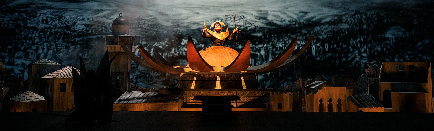 Zu Beginn fällt der Blick auf das Stadtpanorama Jerusalems mit der goldenen Kuppel des Felsendoms im Zentrum, die – kurios genug – Armida als Einstieg in die Szene dient. Am Ende ist dieses Jerusalem noch einmal zu sehen, nun aber mit der zerstörten Kuppel. Symbol für die Schrecken des Krieges, den die geläuterten Personen hinter sich gelassen haben. Die Personenregie erinnert an Horstkottes frühere Phase als Puppenspieler im Marionettentheater. Die Protagonisten agieren ihre Gefühle und Leidenschaften wie an imaginären Fäden gezogen aus. Die äußerst fantasievollen Kostüme korrespondieren eindrucksvoll mit der Ornamentik des Zaubertheaters. Ein Stück irdischer und stereotyper gerieren sich die Dschihadisten. Die Statisten sind mit Patronengürteln bestückt, die mächtig Eindruck machen. Insgesamt ein prachtvolles Spektakel, das Händel und Haymarket-Manager Aaron Hill gewiss gefallen hätte.
