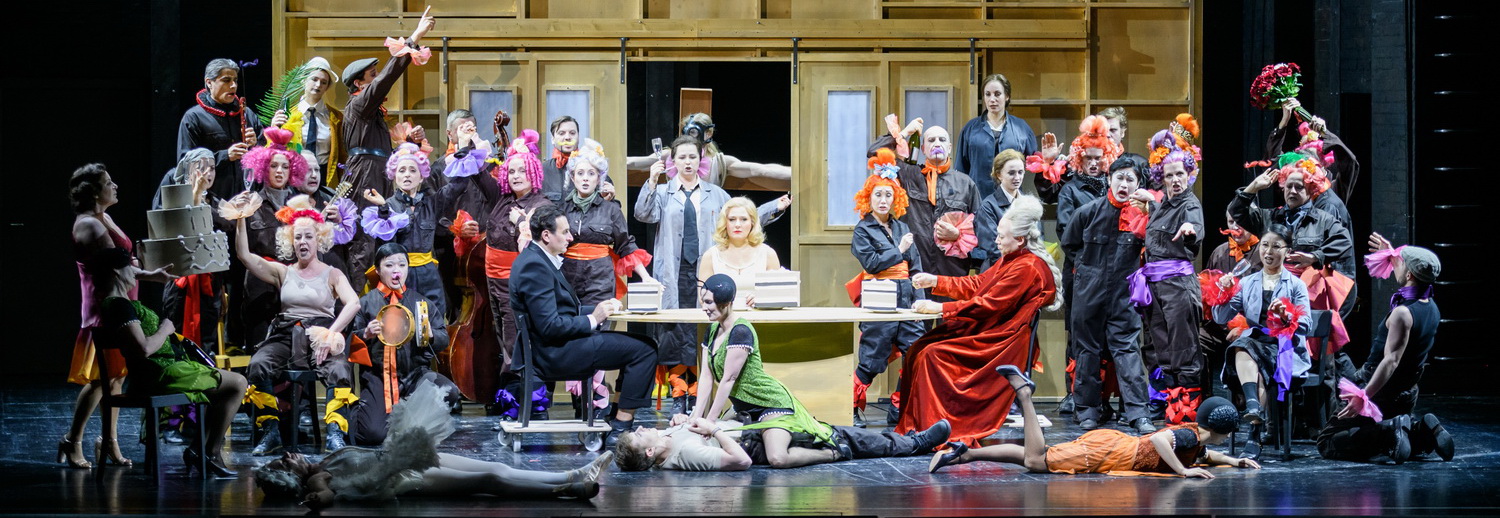 Wie schon bei Prokofjews Liebe zu den drei Orangen 2014 und Brittens Midsummer Night‘s Dream 2015 lässt sich der Regisseur, einmal mehr sein eigener Bühnen­bildner, auch diesmal von Bildern eines Malers inspi­rieren: So erinnern manche Szenen frappant an George Grosz, einen Zeitge­nossen Schost­a­ko­witschs, dessen Sujets drastische und provo­kative Darstel­lungen von Mord und Gewalt wie auch Verspot­tungen der herrschenden Klasse beinhalten. Also wie geschaffen für diese Geschichte. Zudem tauchen in den teils tristen, kargen, schnell wechselnden Kulissen immer wieder auch allego­rische Figuren, deren Kostüme und Choreo­grafie Fabian Posca besorgte, wie ein Tanzbär, ein Pope, wie ein buddhis­ti­scher Mönch ausstaf­fiert, ein Christus mit Gasmaske, ein Schäbiger wie ein Confé­rencier in Netzstrümpfen, Polizisten, wie Clowns maskiert und sich ebenso lächerlich benehmend, auf. Und all das ist mit größter Musika­lität punkt­genau auf die Partitur und großem Detail- und Ideen­reichtum insze­niert. Als Theater im Theater changiert seine Konzeption zwischen krassem Realismus, Subti­lität, ironi­sie­render Satire und Surrealem und geht insgesamt wie ein gespens­ti­scher Thriller unter die Haut.