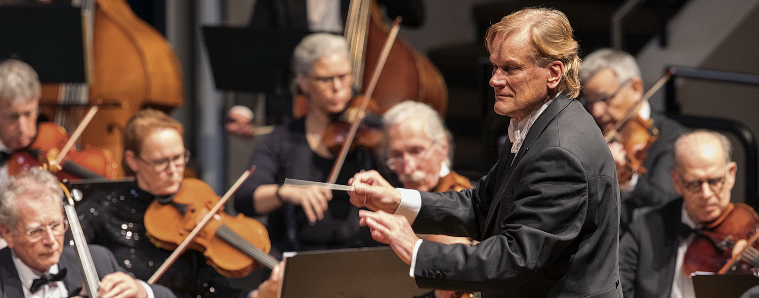 Es ist faszi­nierend zu beobachten, wie Willich die Klang­farben der unter­schied­lichen Instru­men­ten­gruppen zu mischen weiß und deren Trans­parenz bis in die dynamische Steigerung zum Sonnen­aufgang zu gewähr­leisten vermag. Die hält sich bis hin zur Vision und der aufstei­genden Gipfel­passage. Wie exzellent das WDO- und HMK-Sinfo­nie­or­chester gemeinsam zu musizieren vermag, wird auch bei den Passagen Gewitter und dem Abstieg deutlich hörbar. Gerade die stark gefor­derten Bläser behalten hier stets einen sauberen und fließenden Klang, der sich harmo­nisch mit den Strei­chern verbindet. Der Sonnen­un­tergang ist ein weiteres Beispiel dafür, wie Willich es versteht, das klang­liche Mit- und Inein­ander aller Instru­men­ten­gruppen der beiden Orchester zu einem Gesamt­klang zu formen, der alle Klang­re­gister erleuchten lässt und gleich­zeitig demons­triert, mit welcher Souve­rä­nität die Instru­men­ta­listen musizieren. Willich leitet die vielen Übergänge mit leichtem, aber auch energi­schem Schlag. Am Schluss, zum Einbruch der Nacht, als der Abstieg vom Gipfel geschafft ist, schließt sich musika­lisch der Zyklus, und klanglich ist es wieder wie am Anfang, bevor ein neuer Tag in den Bergen beginnt. Als Willich nach dem letzten Takt den Dirigen­tenstab langsam sinken lässt, gibt es einen kurzen Moment der Stille und des Innehaltens, bevor großer Applaus des Publikums für die überzeu­gende Darbietung aufbrandet.