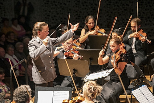 A Tribute to John Williams lautet ein Medley mit Melodien aus Filmklas­sikern wie Star Wars, Jurassic Park, Hook, Jaws und E.T. Eröffnet wird das rund zwölf­mi­nütige Medley mit der Olympic Fanfare, die Williams zur Eröffnung der Olympi­schen Sommer­spiele 1984 in Los Angeles kompo­niert hatte. Schütz-Knospe, nach eigenen Aussagen beken­nender Fan dieser Filme und natürlich der Filmmu­siken von John Williams, leitet ihr HMK und das WDO mit viel Elan und großen Bögen und nimmt die Zuschauer im Saal mit auf eine kleine Filmreise nach Hollywood. Nach diesem Medley wird es emotional, denn mit Halle­lujah steht ein besonders ausdrucks­starkes Lied des vor fünf Jahren verstor­benen kanadi­schen Singer-Songwriters Leonard Cohen auf dem Programm. Es wurde 1984 auf dem Album Various Positions veröf­fent­licht, und es gibt sehr viele Cover-Versionen dieses Songs. An diesem Abend aber gibt es ein Arran­gement von Robert Kuckertz für großes Sinfo­nie­or­chester, wobei Chris­topher Buchheim am Sopran-Saxofon die Solo-Gesangs­stimme imitiert, dabei virtuos mit Jazz- und Blues­ele­menten impro­vi­siert und die Darbietung zu einem beson­deren Erlebnis werden lässt, das beim Publikum natürlich großen Applaus hervorruft. Das Finale des Konzertes ist wieder ein Medley, diesmal geht Schütz-Knospe dreißig Jahre zurück in das Jahr 1991, und lässt die Zeit mit Songs wie Wind of Change von den Scorpions, The Shoop Shoop Song von Cher, I do it for you von Bryan Adams und Rhythm of My Heart von Rod Stewart wieder lebendig werden. Auch dieses Arran­gement für großes Sinfo­nie­or­chester stammt aus der Feder von Kuckertz. Nach dem beglü­ckenden Finale dürfen die Zugaben nicht fehlen. Als erstes steht der berühmte Radetzky-Marsch von Johann Strauss Vater auf dem Programm. Schütz-Knospe führt nicht nur das WDO- und HMK-Sinfo­nie­or­chester mit energi­schem Schlag, sondern leitet auch das Publikum mit strengem Blick und einem Lächeln auf den Lippen an, wann es zum Takt klatschen darf und wann nicht, ein herrlicher vorge­zo­gener Neujahrs-Gruß. Das Publikum, das sich voller Begeis­terung für diese außer­ge­wöhn­liche Darbietung von den Plätzen erhoben hat, lässt die Musiker ohne eine zweite Zugabe nicht gehen, und so wird Rhythm of My Heart noch einmal wiederholt.