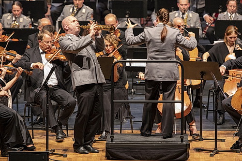 Der Oberstarzt ist nicht nur Direktor der Klinik für Herzchir­urgie am Bundes­wehr­zen­tral­kran­kenhaus Koblenz, sondern seit über elf Jahren auch als leiden­schaft­licher Trompeter für das WDO im Einsatz. Warum also nicht beide Profes­sionen verbinden, dachte sich Feyrer und brachte das HMK und das WDO zu einer erstma­ligen Koope­ration zusammen. Natürlich spielt Feyrer sein Instrument an diesem Abend im WDO, lässt es sich aber nicht nehmen, die etwa 900 Zuschauer in der Koblenzer Rhein-Mosel-Halle persönlich zu begrüßen und charmant in das Konzert einzu­führen. Dass es bei diesem Konzert ein strenges Hygie­ne­konzept gibt, versteht sich von selbst.