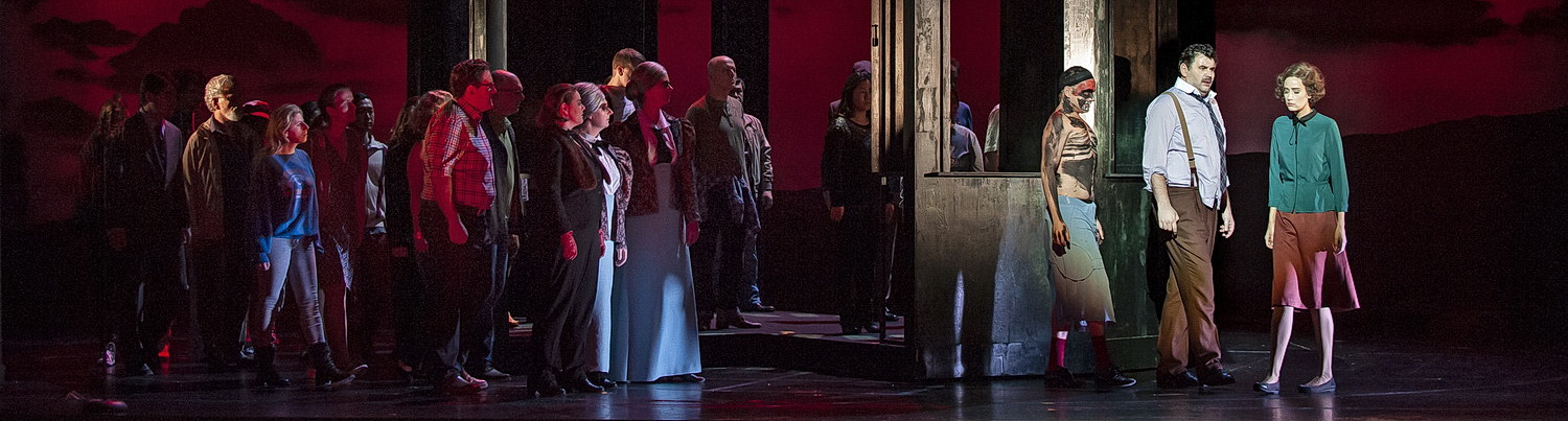 Waltraud Lehner, schon 2017 bei Glare mit der Regie betraut, hat in den solistischen Hauptpartien, dem Chor in der Einstudierung von Aki Schmitt sowie in den schauspielernden Darstellern insgesamt ein Ensemble zur Verfügung, das mit Elan, Engagement und Spielwitz imponiert. Den Rahmen hierfür bietet die von Ulrich Frommhold erschaffene, multiple Bühne mit ihrer Drehtechnik, die die unterschiedlichen Schauplätze auf dem Hintergrund einer düsteren Mauer plastisch ins Bild rückt. So die tristen Straßen und das Hinterhofmilieu der Großstadt, das Casino, die Terrasse auf dem Landsitz. Ein Übriges erreichen die Kostüme von Dorothee Brodrück und Eva Martin mit ihrer milieugerechten Optik. Davon profitiert ganz besonders Danielle Rohr in der Rolle der Petra. Kleider und Dessous weisen sie als das aus, was sie gerade spielt: die zerstörte Existenz, die erwartungsvolle Braut, die enttäuschte Liebende.