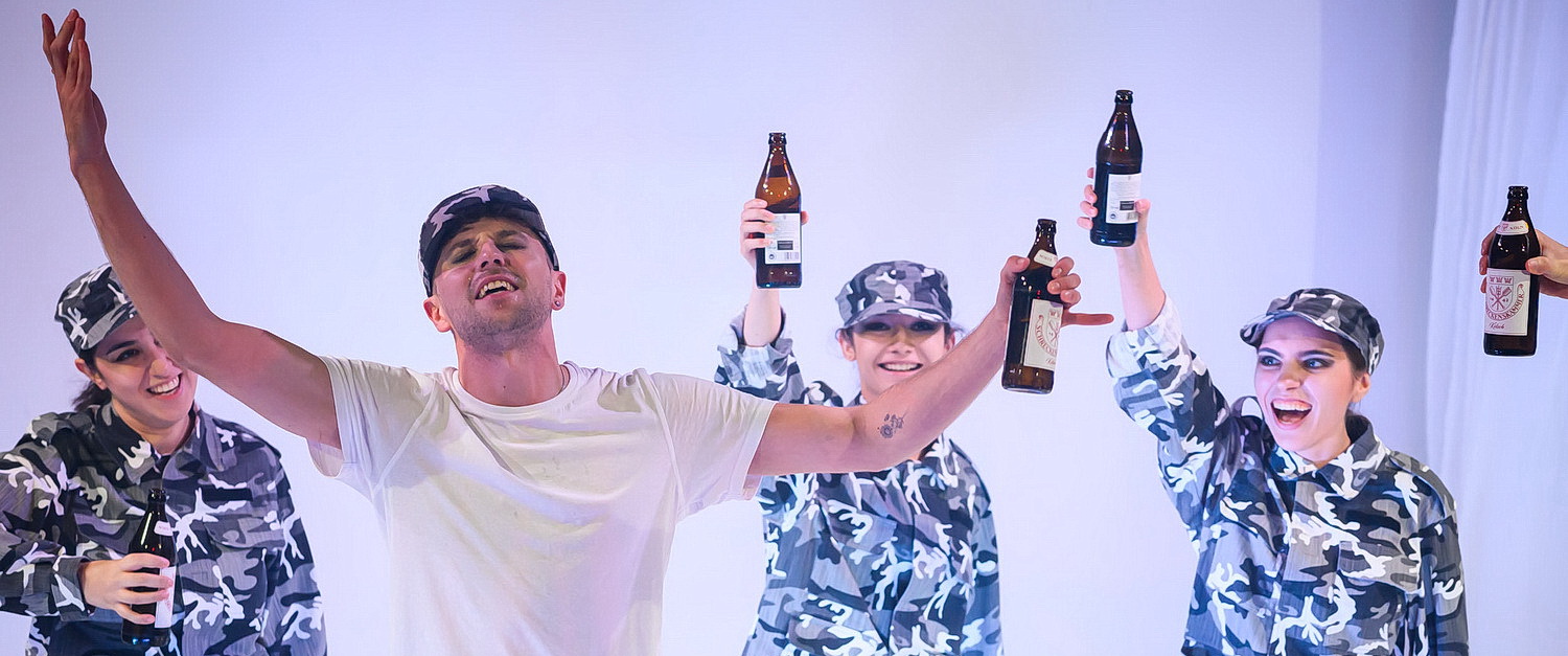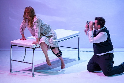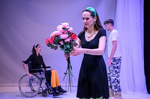 In diesem Umfeld agieren die Studenten gern. Allen voran Christopher Auer, längst eine feste Größe im sich sonst ständig ändernden Ensemble, der als Dr. Condor alles gibt. Ohnehin immer von großer Spielfreude beseelt, hat ihm der Komponist diesmal zwei, drei durchaus anspruchsvolle Stellen in die Rezitative geschrieben. Und seinen „Amok-Song“ radelnd zu absolvieren, ist auch nicht ohne. Die einzige Mini-Arie des Abends bestreitet Laura Kriese als Frau Kekesvalva, Ediths Mutter, zumindest teilweise im Liegen. Ihre Rolle nimmt man ihr trotz des jugendlichen Alters voll und ganz ab. Ebenfalls überzeugen kann Silja Bothe vor allem im glaubhaften Umgang mit der Körperbehinderung der Edith. Da steht ihr Singe Ciftci als blinde Frau des Arztes – und in einer Doppelrolle als Militärkamerad Hofmillers – in nichts nach. Bei beiden gefällt besonders, wie selbstverständlich sie ihre Behinderungen darstellen.