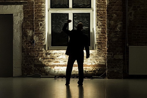 Vor der Tribüne breitet sich der leere Saal aus. In der rechten Hälfte hängt eine Leinwand herunter, die später Fläche für Projek­tionen und Kommu­ni­kation, aber auch Rückzugsort für den Tänzer bietet. Vorfreude liegt in der Luft, während das Licht erlischt. Vor dem Fenster an der Rückseite der linken Saalhälfte fährt Wolfgang Pütz, der das Licht­design verant­wortet, einen Licht­bogen hoch. Davor steht Balbernie, jetzt barfuß im Straßen­anzug mit weißem Hemd mit dem Rücken zum Publikum. Die stamp­fenden Rhythmen von Fuck Buttons dröhnen über die Lautsprecher. Angus boxt sich durch das Leben. Und er gibt schon hier ein Statement ab. Die lebenslang eingeübte Leich­tigkeit der Bewegungs­ab­läufe verliert sich auch im Alter nicht. Gewiss, der Atem wird kürzer, die Bewegungen fallen nicht mehr so leicht wie früher, auch der Körper hat die Entbeh­rungen der vergan­genen Jahre verkürzt und damit von seiner Form eingebüßt. Dennoch hat die Grund­spannung den Körper nicht verlassen. André Zimmermann untermalt auch späterhin spannende Einfälle mit seinem längst preis­ge­krönten Sounddesign.