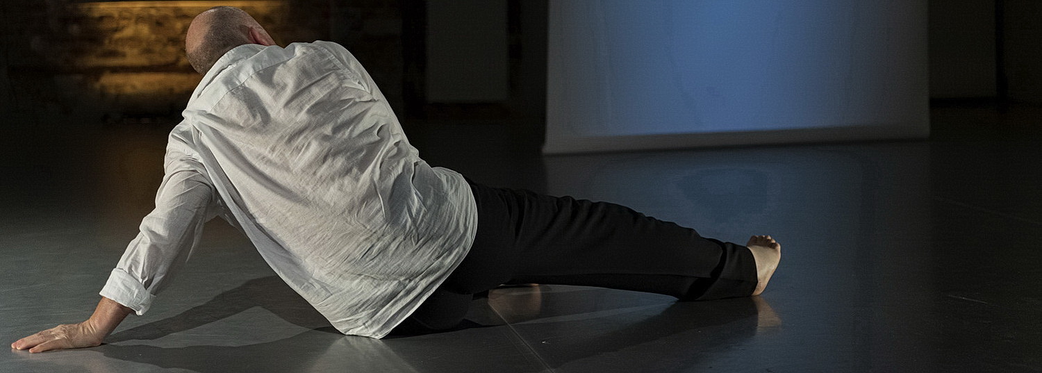 Vor der Tribüne breitet sich der leere Saal aus. In der rechten Hälfte hängt eine Leinwand herunter, die später Fläche für Projek­tionen und Kommu­ni­kation, aber auch Rückzugsort für den Tänzer bietet. Vorfreude liegt in der Luft, während das Licht erlischt. Vor dem Fenster an der Rückseite der linken Saalhälfte fährt Wolfgang Pütz, der das Licht­design verant­wortet, einen Licht­bogen hoch. Davor steht Balbernie, jetzt barfuß im Straßen­anzug mit weißem Hemd mit dem Rücken zum Publikum. Die stamp­fenden Rhythmen von Fuck Buttons dröhnen über die Lautsprecher. Angus boxt sich durch das Leben. Und er gibt schon hier ein Statement ab. Die lebenslang eingeübte Leich­tigkeit der Bewegungs­ab­läufe verliert sich auch im Alter nicht. Gewiss, der Atem wird kürzer, die Bewegungen fallen nicht mehr so leicht wie früher, auch der Körper hat die Entbeh­rungen der vergan­genen Jahre verkürzt und damit von seiner Form eingebüßt. Dennoch hat die Grund­spannung den Körper nicht verlassen. André Zimmermann untermalt auch späterhin spannende Einfälle mit seinem längst preis­ge­krönten Sounddesign.
