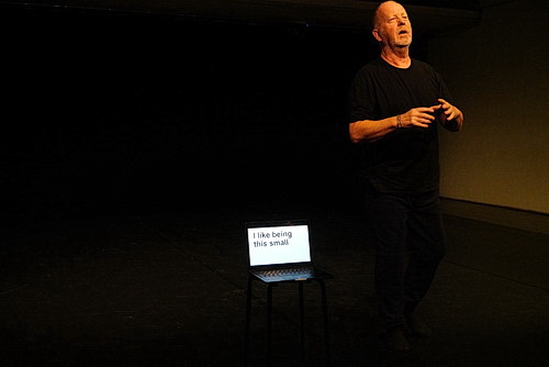 Einen anderen Zugang wählt Angus McLean Balbernie. Mit 69 Jahren inter­es­sieren ihn die wilden Exzesse junger Tänzer nicht mehr. Er hat sich mehr als ausgetobt in seinem Leben, hat getanzt, choreo­gra­fiert, impro­vi­siert und unter­richtet. Ihn inter­es­siert die Aufge­regtheit, mit der Themen heute durch die Gesell­schaft geprügelt werden, nicht mehr. I Like Crime Shows, Mountains and Maybe 3 People lautet konse­quent der Titel seines Impro­vi­sa­ti­ons­solos: Ich mag Krimi­serien, Berge und vielleicht drei Leute. Er betritt die Bühne mit einem Notebook, das kaum größer als ein Tablet ist, und einem Stuhl. Eigentlich hätte hier jetzt die ganz große Show statt­finden können, mit neun Tänzern oder so. Statt­dessen wolle er hier eine Präsen­tation zeigen, erzählt er. Aber wenn jemand aus dem Publikum zum Tanzen auf die Bühne kommen wolle, sei derjenige herzlich einge­laden. Während eine zweispra­chige Präsen­tation auf dem Notebook abläuft, das auf dem Stuhl seinen Platz gefunden hat, bewegt Balbernie sich durch den Raum. Es ist ein Erlebnis, ihm zuzuschauen, wenn er zwischen den Gängen in hauch­zarte Tanzposen verfällt, eben so angedeutet, um dann weiter zu parlieren. Wenn es irgend­eines Beweises bedurfte, dass sich zeitge­nös­si­scher Tanz nicht in HipHop oder Urban Dance erschöpft, liefert ihn Balbernie mit alters­phi­lo­so­phi­scher Weitsicht und tänze­ri­scher Grandezza zu unter­schied­lichsten Musik­rich­tungen – nicht ohne, die Zuschauer mit typisch briti­schem Humor zum Schmunzeln zu bringen. Hinter diesem Auftritt kann sich so mancher Hype verstecken.