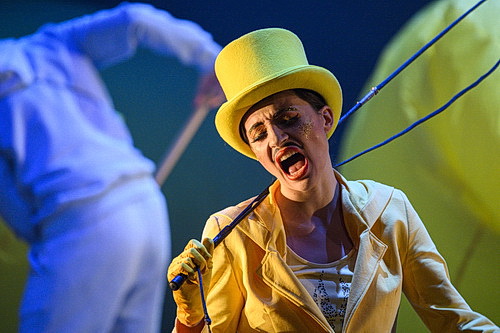 Man möchte nicht in den Schuhen von Regisseur Thilo Reinhardt stecken. Er muss sich nicht nur um seine Darsteller kümmern, sondern auch mit einer Arbeitsgruppe der Hochschule für Gestaltung Offenbach zusammenarbeiten, die Ausstattung und Kostüme übernimmt. Der Erfolg ist vorhersehbar. Es gibt verrückte Kostüme, eine aufwändige Bühne, aber niemanden, der Ahnung von Akustik hat. Doch der Reihe nach. Wie üblich, ist das Bühnenbild in drei Teile aufgeteilt. Eingangs das Haus der von Eisensteins, es folgt der Ball von Orlofsky und die Szene im Gefängnis der Stadt. Alles ist großzügig gebaut, wird aber dann kaum genutzt, weil der Hauptteil der Handlung an der Rampe stattfindet. Reinhardt gelingt es, aus allen Situationen das Größtmögliche an Humor herauszuholen, ohne in Klamauk zu verfallen – auch wenn der Staubsauger ohne jedes Geräusch funktioniert. Es gibt viel zu schmunzeln an diesem Abend. Die Kostüme sind im Sweatshirt-Stoff gehalten, was viel Glanz nimmt, aber den Zuschauern gefällt. Es gibt Masken, die zunächst an Hasen erinnern, später kommt die Maske von Rosalinde hinzu, die zwar genauso aussieht, aber eine Pferdemaske zu sein scheint. Die Masken sind nicht gesangstauglich und müssen deshalb hochgeklappt werden. Bei der Ballszene muss selbst Reinhardt aufstecken. Während die Bühne mit überdimensionalen Bananen gespickt wird, erstarrt die Festgesellschaft und kommt erst wieder in Bewegung, um einen „ungarischen Fahnentanz“ aufzuführen. Der immerhin nutzt endlich einmal die gesamte Bühne. Ansonsten muss Reinhardt alle Kraft aufwenden, um die Bewegung im Raum aufrechtzuerhalten. Das führt im Gefängnis zu teilweise absurden Szenen, wenn beispielsweise eine mobile Tür ins Zentrum des Geschehens gerät.