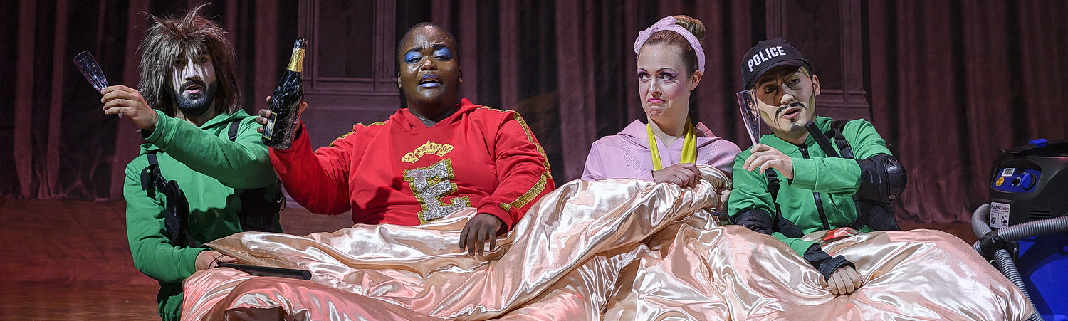 Man möchte nicht in den Schuhen von Regisseur Thilo Reinhardt stecken. Er muss sich nicht nur um seine Darsteller kümmern, sondern auch mit einer Arbeitsgruppe der Hochschule für Gestaltung Offenbach zusammenarbeiten, die Ausstattung und Kostüme übernimmt. Der Erfolg ist vorhersehbar. Es gibt verrückte Kostüme, eine aufwändige Bühne, aber niemanden, der Ahnung von Akustik hat. Doch der Reihe nach. Wie üblich, ist das Bühnenbild in drei Teile aufgeteilt. Eingangs das Haus der von Eisensteins, es folgt der Ball von Orlofsky und die Szene im Gefängnis der Stadt. Alles ist großzügig gebaut, wird aber dann kaum genutzt, weil der Hauptteil der Handlung an der Rampe stattfindet. Reinhardt gelingt es, aus allen Situationen das Größtmögliche an Humor herauszuholen, ohne in Klamauk zu verfallen – auch wenn der Staubsauger ohne jedes Geräusch funktioniert. Es gibt viel zu schmunzeln an diesem Abend. Die Kostüme sind im Sweatshirt-Stoff gehalten, was viel Glanz nimmt, aber den Zuschauern gefällt. Es gibt Masken, die zunächst an Hasen erinnern, später kommt die Maske von Rosalinde hinzu, die zwar genauso aussieht, aber eine Pferdemaske zu sein scheint. Die Masken sind nicht gesangstauglich und müssen deshalb hochgeklappt werden. Bei der Ballszene muss selbst Reinhardt aufstecken. Während die Bühne mit überdimensionalen Bananen gespickt wird, erstarrt die Festgesellschaft und kommt erst wieder in Bewegung, um einen „ungarischen Fahnentanz“ aufzuführen. Der immerhin nutzt endlich einmal die gesamte Bühne. Ansonsten muss Reinhardt alle Kraft aufwenden, um die Bewegung im Raum aufrechtzuerhalten. Das führt im Gefängnis zu teilweise absurden Szenen, wenn beispielsweise eine mobile Tür ins Zentrum des Geschehens gerät.
