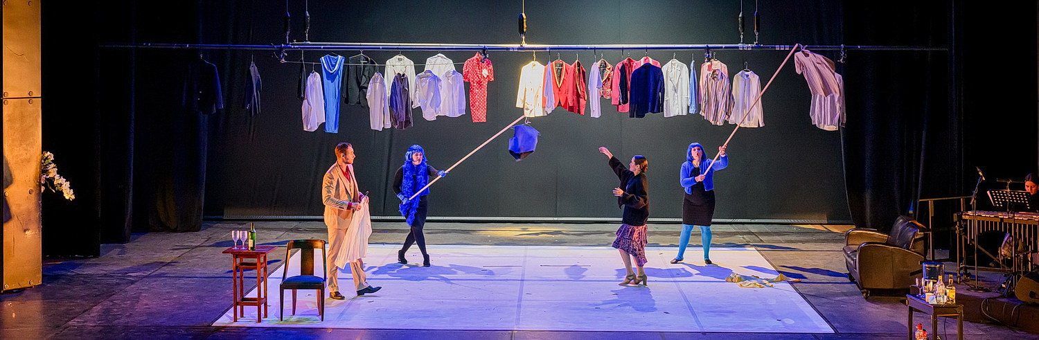 Wie immer hat auch bei der aktuellen Litera­turoper Durban die Bühne entworfen. Der Hinter­grund ist Projek­tionen von Daniel Gronsfeld auf einer vollständig füllenden Leinwand vorbe­halten, die nicht immer erkennbar sind, aber Ortswechsel verständlich werden lassen. Die Spiel­fläche wird je nach Handlung mit Requi­siten bestückt. Rechts auf einem Podest sitzen vier Musiker. Vor der Bühne sind zwei große Konzert­flügel aufgebaut, vor denen der Dirigent sitzt. Die teils „realis­ti­schen“, teils überaus fanta­sie­vollen Kostüme hat Angela C. Schuett beigesteuert. Thomas Vervoorts hat sich mit viel Aufwand um das Licht gekümmert. Kleinere Pannen werden sich in den Folge­vor­stel­lungen sicher nicht wiederholen.