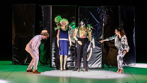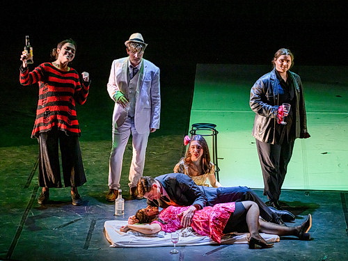 Im Programmheft ist von einer Kammeroper die Rede. Der Perso­nal­aufwand kann damit kaum gemeint sein. Da es sich hier um eine studen­tische Aufführung handelt, wäre es ja auch eine Schande, wenn man nicht wenigstens vierzehn Akteure auf die ausrei­chend große Bühne bringt. Einer der wenigen Fälle, in denen nicht das Personal den höchsten Kosten­aufwand verur­sacht. Erfreulich, dass die Sänger mit einer durchweg hohen Qualität beein­drucken. Ganz vorn steht dabei Ich-Erzähler Nick, Josef Zetterberg-Pihl. Sein in jungen Jahren balsa­mi­scher Bass lässt aufhorchen. Hier steht ein großes Talent auf der Bühne. Aller­dings ist bei ihm wie bei den anderen beiden männlichen Haupt­rollen wenig Perso­nen­führung zu sehen. Das kennt man bei Regisseur Durban eigentlich gar nicht. Aber so oft, wie die drei mit ausge­brei­teten Armen an der Rampe stehen, ist die Fanta­sie­lo­sigkeit schon augen­fällig. Aber was heißt Regisseur? Müsste ein Regisseur die Aufgaben erfüllen, die Durban während der Produktion zufallen, hätte jeder andere vermutlich längst die Segel gestrichen. Da wäre eine Regie­as­sistenz vonnöten, die verstärkt auch auf die Bewegungs­ab­läufe achtet.