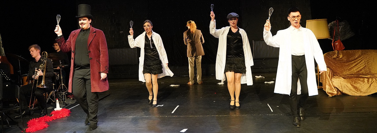 Das Theater hat eine ausreichend große Bühne, um den fünf Protagonisten und einem kleinen Orchester Platz zu bieten. Der Bühnenraum ist vollständig schwarz ausgekleidet. Im Hintergrund ist ein Lichterfeld angebracht. Links drängen sich neun Musiker, denen Stephan Wehr als musikalischer Leiter vorsteht. Rechts sind ein Sofa und ein paar Utensilien untergebracht. Hinter dem Sofa und hinter dem Orchester geben schwarze Vorhänge zusätzlich Platz, damit die Darsteller sich umziehen können. Und sie müssen sich oft umziehen. Durban ist als Regisseur auch für die Bühne und die Kostüme zuständig. Beides ist bis auf das i‑Tüpfelchen durchdacht. Insbesondere die Kostüme bereiten viel Freude auf der gut besuchten Tribüne. Mit wenigen Mitteln wie Korsettagen, Kitteln, Brillen und Kopfschmuck lässt Durban die Darsteller immer wieder in zahlreiche andere Rollen schlüpfen. Ein paar Requisiten reichen dem Regisseur, entsprechende Welten entstehen zu lassen. Dazu kommt eine Personenführung, die keinen Moment Langeweile entstehen lässt. Und passend zur Musik hat Michaela Niederhagen sich wunderbare Choreografien einfallen lassen. Dass die Darsteller allesamt keine Ambitionen haben, an einem Charleston-Wettbewerb teilzunehmen, ist klar, aber für die wenigen erforderlichen Schritte reicht es und so kommt ordentlich Schwung in die Aufführung. Thomas Verfoorts untermalt mit den vergleichsweise wenigen technischen Mitteln, die ihm zur Verfügung stehen, mit seinem Licht sehr schön die Stimmungen, von denen es in der Berg- und Talfahrt zwischen Euphorie und Wahnsinn einige zu zeigen gilt.