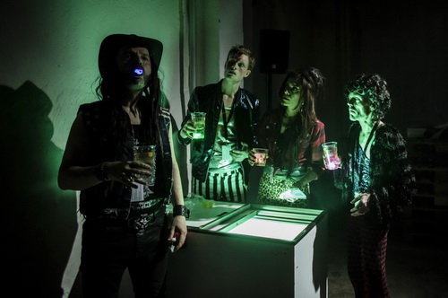 Wie man sich eine solche Vorhölle vorzustellen hat, zeigt Bleikamp schon einmal in der Kölner Orangerie mit ihrem neuen Stück Heroes, also Helden. Ein großer, schmuckloser Raum mit einer vergleichsweisen Zuschauertribüne und einer großen Spielfläche, auf der zwei quer zueinander stehende Stege aufgebaut sind. Der hintere ist auf der einen Seite begrenzt von einem Keyboard, auf der anderen Seite von Palletten, auf denen eine Unmenge von Flaschen aufgebaut sind, deren Etiketten alkoholische Inhalte verraten. Hinter dem Steg schließt ein weißer Vorhang den Raum nach hinten ab und gibt Fläche für Videos, die Jens Standke ausgewählt hat. Am rechten Rand sind vier Trockenhauben mit Stühlen davor aufgebaut, links steht eine Tiefkühltruhe. Ein hermetisch abgeschlossener Raum, in dem Amy Winehouse seit fünf Jahren gefangen ist. Als Lemmy Kilmister und anschließend Prince respektive David Bowie dazustoßen, wird Amy nervös, weil die Alkohol-Vorräte nicht unendlich verfügbar erscheinen. Es beginnt eine Revue, die an Sartres „Die Hölle, das sind die anderen“ erinnert. Versteht man das postdramatische Theater als Gegenstück zum Sprechtheater, ist hier eine gelungene Aufführung zu sehen – wenn etwas zu sehen ist, denn mit Theaternebel wird wahrlich nicht gespart. Sinnvolle Sätze sind kaum zu vernehmen, allenfalls Zitate tauchen als Erinnerungsfetzen auf, untermalt von den Videos. Beständig sind vier Schauspieler in Aktion, imitieren typische Bühnenauftritte, die – aus der Zeit gefallen – eher komisch wirken. Sie wirken wie Anachronismen ihrer selbst, blutleer und entkräftet beschwören sie vergangene Zeiten herauf, die nicht mehr faszinieren können. Bis ins Detail beleuchtet Peter Behle das mit Weißlichtabstufungen bis hin zu witzigen, kleinen Einfällen. Nur die Poesie bleibt ebenso wie das Drama auf der Strecke.